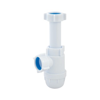 Durable polypropylene construction with telescopic inlet and compression-type outlet. Feeds water out through the system, trapping sink debris to prevent it from clogging the plumbing system. Prevents odours from passing back into the home. Suitable for use with plastic and copper pipes. Made in the..